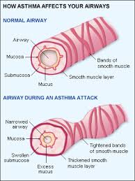 During an asthma episode, inflamed airways react to environmental triggers such as smoke, dust, or pollen. The airways narrow and produce excess mucus, making it difficult to breathe. In essence, asthma is the result of an immune response in the bronchialairway.